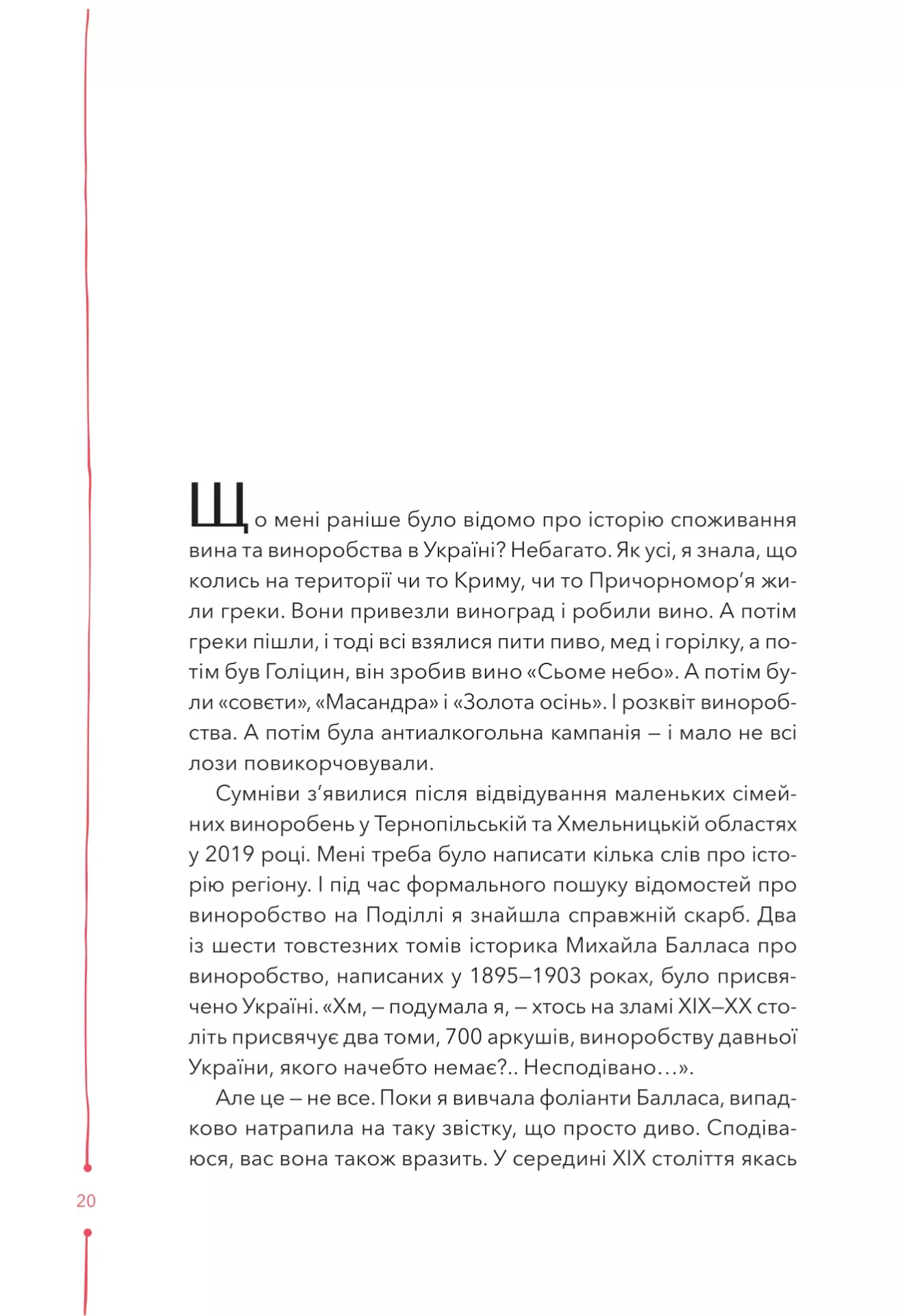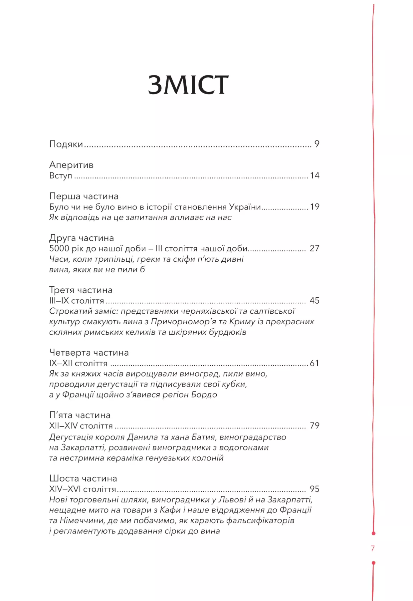 Мандруючи крізь епохи й відвідуючи низку країн, авторка розповідає, як про схожі риси в розвитку різних виноробних країн, так й про відмінності. Чи здогадувались ви, що у розвитку виноробства в Бордо та в Мукачево є спільні риси? Чи знали, що у Львові був свій «винний бум», а гетьмани мали винні погреби та замовляли собі тисячі виноградних лоз? Також дослідниця говорить винні смаки відомих історичних персонажів: Тараса Шевченка, Івана Франка, Миколи Гоголя та Григорія Сковороди. Анна Євгенія Янченко ділиться фактами про вплив козацтва та козацької старшини на виноробну індустрію України. Розповідає про «церковні вина» та про медалі українських вин на міжнародних виставках. Вона не обходить стороною радянський період створення вин та логічно пояснює, звідки брались вина «грушки-яблучка», «чорнила» та «бормотуха» й чому вони мали такий жахливий смак. Окрім цього, в книзі окреслено сучасний стан виноробної галузі України на міжнародній арені та вказано вина, які наразі представляють Україну за кордоном, зокрема в Музеї вина Cité du Vin у Бордо, Франція.